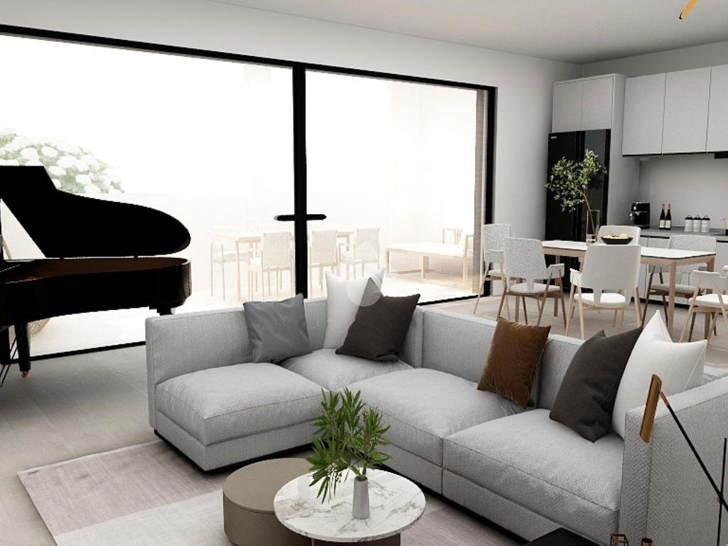 Composizione: zona living open space ampia e luminosa, con grandi superfici vetrate e forte continuità interno/esterno