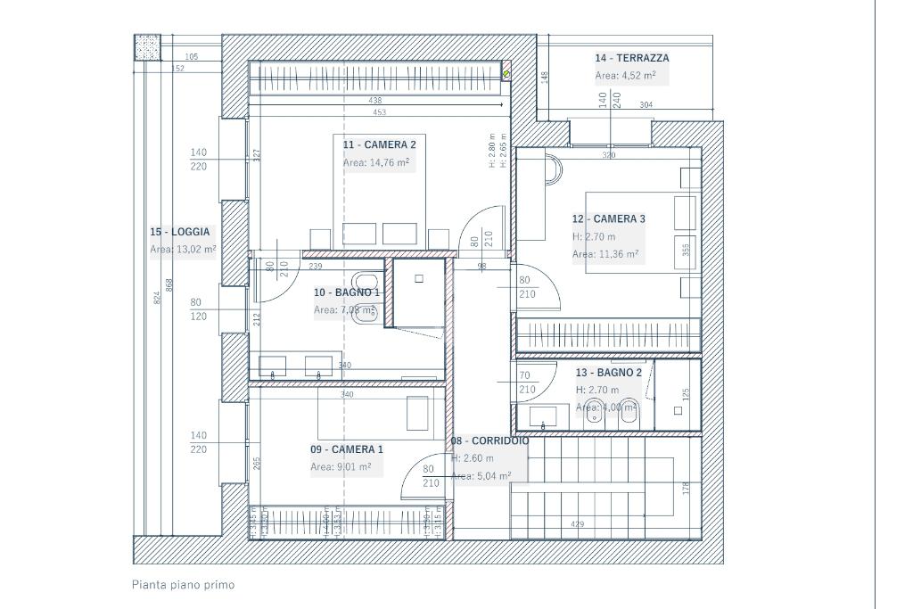 Piano Primo: tre camere da letto, di cui una singola e due matrimoniali, due servizi, di cui uno privato per la camera patronale.