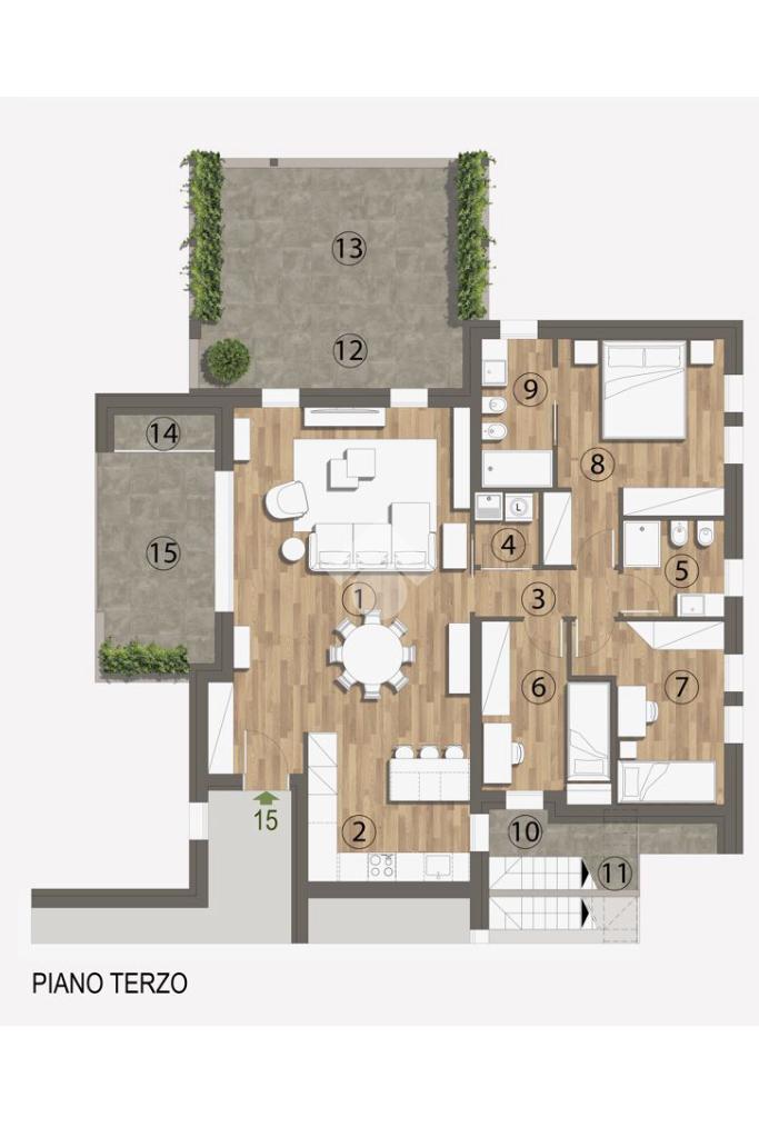 Piano terzo: ingresso su ampia zona giorno composta da soggiorno e sala da pranzo, collegata alla cucina separata e abitabile. La zona living è servita da una grande terrazza e da una loggia, ideali come estensione dello spazio abitativo all’esterno.