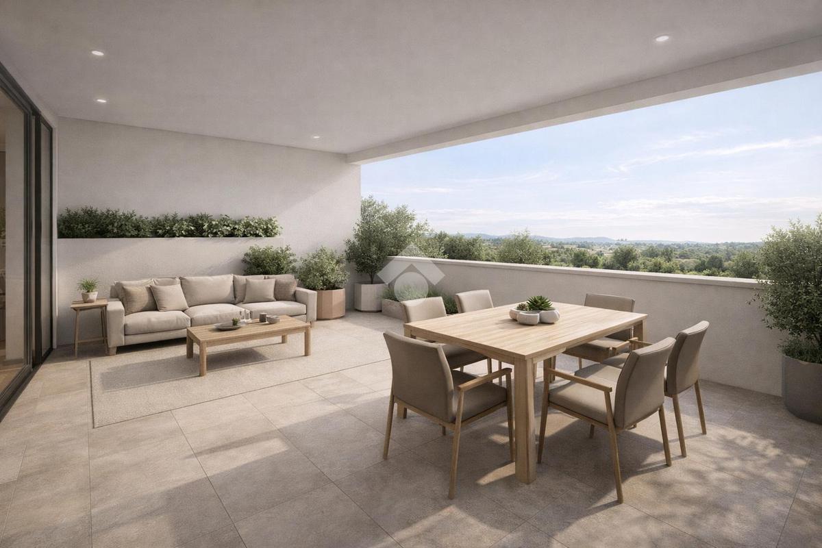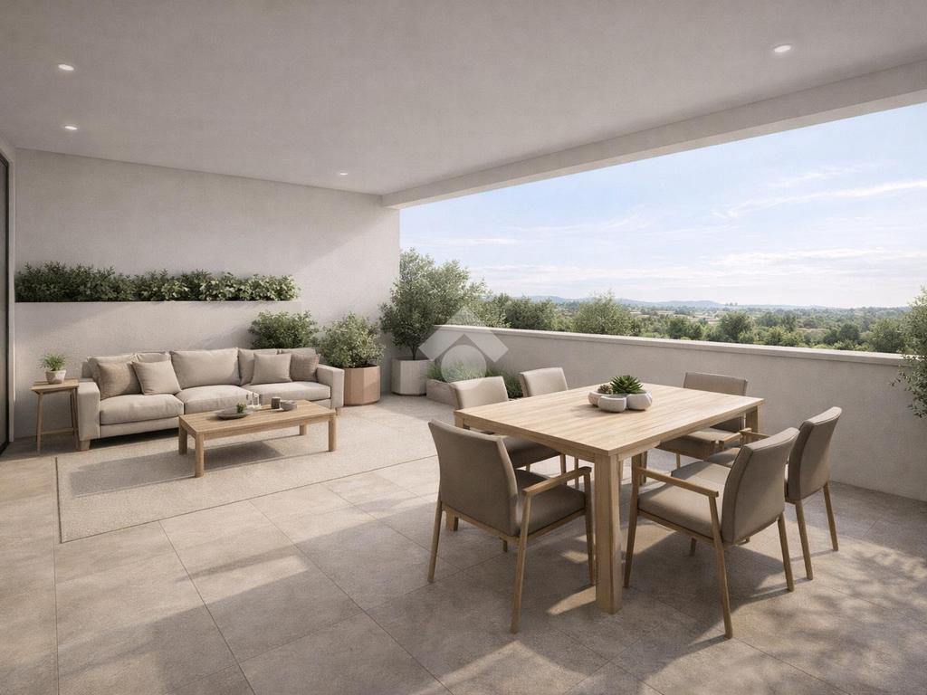 Situato al piano secondo di un moderno edificio dotato di ascensore, affacciato sulla piazza centrale, l'immobile si estende su una superficie di 103 mq. Gli spazi interni comprendono due camere da letto, due bagni, un soggiorno luminoso con angolo cottura. Un balcone e un ampio terrazzo offrono spazi esterni ideali per momenti di relax.